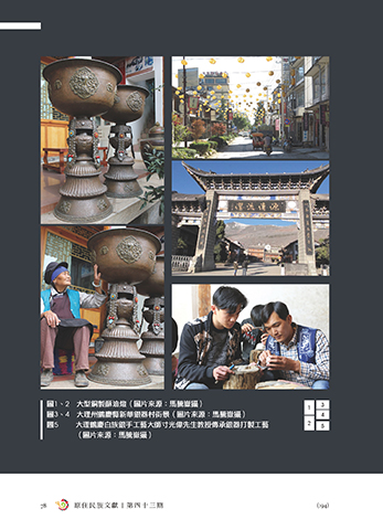 圖1、2 大型銅製酥油燈(圖片來源:馬騰嶽攝) 3 1 圖3、4 大理州鶴慶縣新華銀器村街景(圖片來源:馬騰嶽攝) 4 圖5 大理鶴慶白族銀手工藝大師寸光偉先生教授傳承銀器打製工藝 2 5 (圖片來源:馬騰嶽攝) 78 原 住 民 族 文 獻 | 第 四 十 三 期 (194)