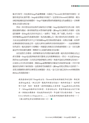 獲得高度的社會評價。Sanga身分與地位的賦予,也呈現出Taromak社會階層、權力