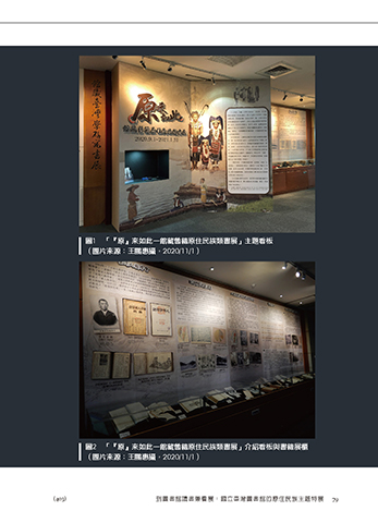 圖1 「『原』來如此—館藏舊籍原住民族類書展」主題看板 (圖片來源:王鵬惠攝,2020/11/1) 圖2 「『原』來如此—館藏舊籍原住民族類書展」介紹看板與書籍展櫃 (圖片來源:王鵬惠攝,2020/11/1) (403) 到圖書館讀書兼看展:國立臺灣圖書館的原住民族主題特展 79