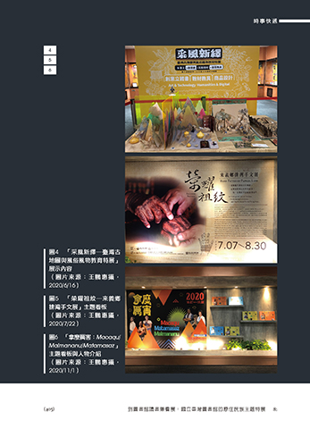 時事快遞 4 5 6 圖4 「采風新繹―臺灣古 地圖與風俗風物教育特展」 展示內容 (圖片來源:王鵬惠攝, 2020/6/16) 圖5 「榮耀祖紋―來義鄉 排灣手文展」主題看板 (圖片來源:王鵬惠攝, 2020/7/22) 圖6 「拿麼厲害:Macaqu/ Malmananu/Matamasaz」 主題看板與人物介紹 (圖片來源:王鵬惠攝, 2020/11/1) (405) 到圖書館讀書兼看展:國立臺灣圖書館的原住民族主題特展 81