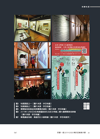 時事快遞 圖3 特展展區之一(圖片來源:李莎莉攝) 3 4 圖4 特展展區之二(圖片來源:李莎莉攝) 5 7 圖5 導覽解說南島語族群體遷徙過程(圖片來源:李莎莉攝) 6 圖6 2019年12月8日8位南島藝術家在北投文物館二樓大廣間舉辦音樂會 (圖片來源:李莎莉攝) 圖7 專題講座海報,邀請四位大師開講(圖片來源:李莎莉提供) (91) 回顧一場 2019-2020 精彩的南島大展 77