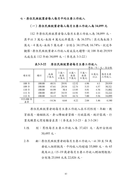 (一)原住民族就業者每人每月主要工作收入為 34,099 元