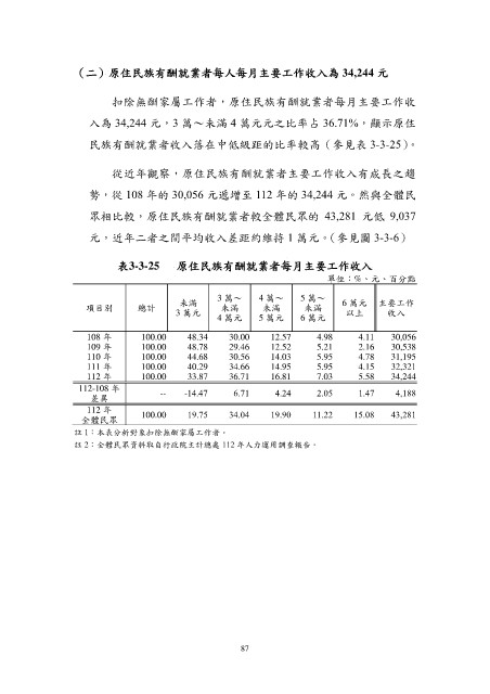 表3-3-25 原住民族有酬就業者每月主要工作收入