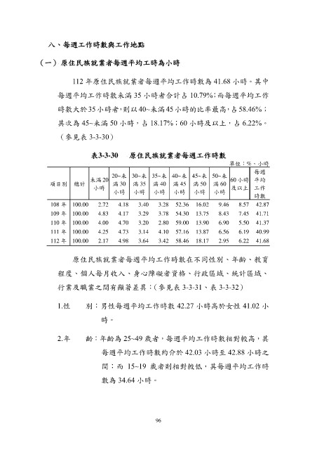 112 年原住民族就業者每週平均工作時數為 41.68 小時。其中