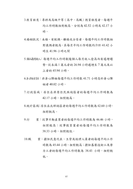 對喪偶者較高,其每月平均工作時數約介於 41.42 小