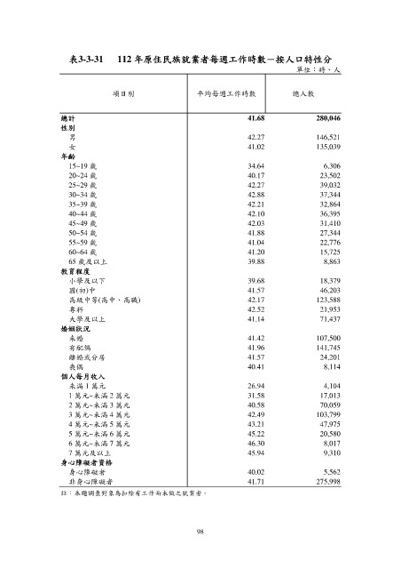表3-3-31 112 年原住民族就業者每週工作時數-按人口特性分