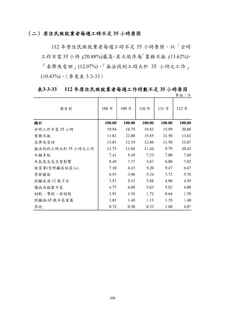 表3-3-33 112 年原住民族就業者每週工作時數不足 35 小時原因