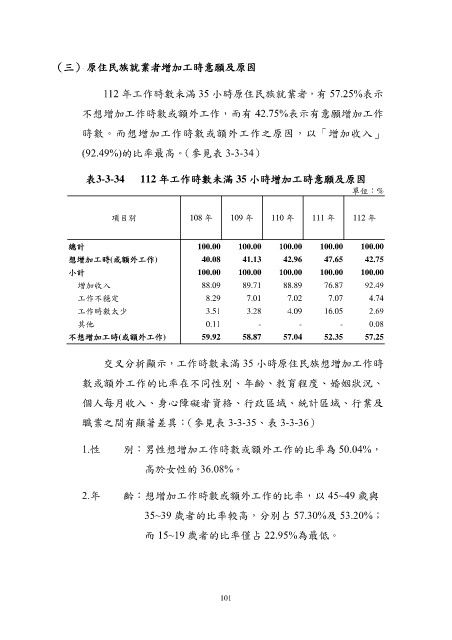 表3-3-34 112 年工作時數未滿 35 小時增加工時意願及原因