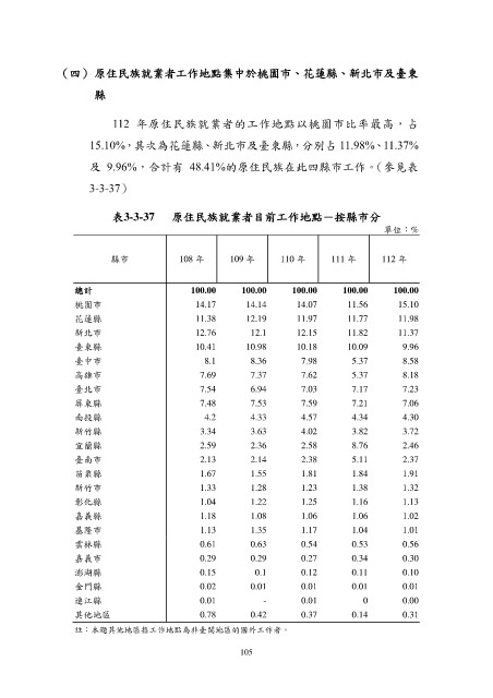 (四) 原住民族就業者工作地點集中於桃園市、花蓮縣、新北市及臺東