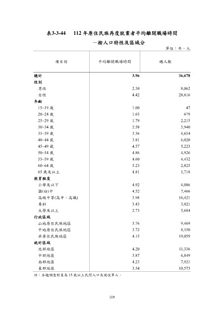 表3-3-44 112 年原住民族再度就業者平均離開職場時間