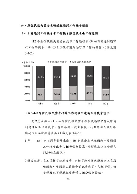 112 年原住民族失業者在找尋工作過程中,34.69%有遇到過可