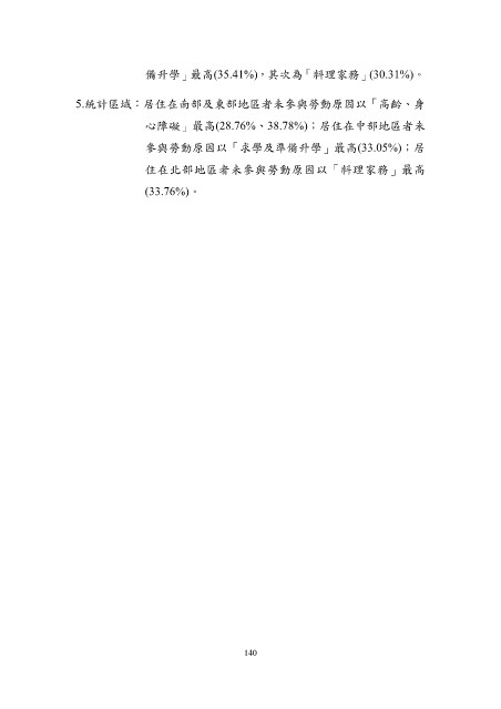 備升學」最高(35.41%),其次為「料理家務」(30.31%)。 5.統計區域:居住在南部及東部地區者未參與勞動原因以「高齡、身 心障礙」最高(28.76%、38.78%);居住在中部地區者未 參與勞動原因以「求學及準備升學」最高(33.05%);居 住在北部地區者未參與勞動原因以「料理家務」最高 (33.76%)。 140