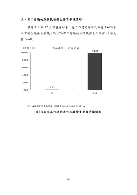 三、有工作過的原住民族發生勞資爭議情形 根據 112 年 12 月調查節結果,有工作過的原住民族有 1.67%表 示曾發生過勞資爭議,98.33%有工作過的原住民族表示沒有。(參見 圖 3-6-8) (單位:%) 資料時間:112年12月 98.33 100.00 80.00 60.00 40.00 20.00 1.67 0.00 有 沒有 註:本題調查對象為有工作經驗者未加權樣本數 11,703 人。 圖3-6-8 有工作過的原住民族發生勞資爭議情形 150