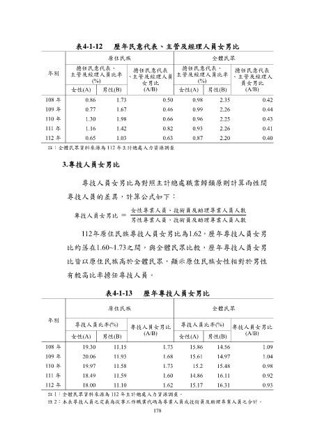 112年原住民族專技人員女男比為1.62,歷年專技人員女男