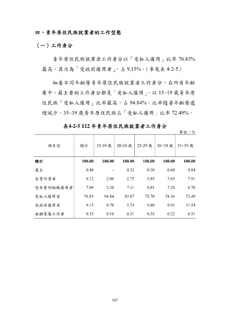 增減少,35~39 歲青年原住民族占「受私人僱用」比率 72.49%。