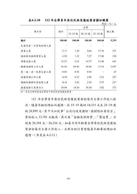 表4-2-10 112 年在學青年原住民族受僱就業者擔任職業
