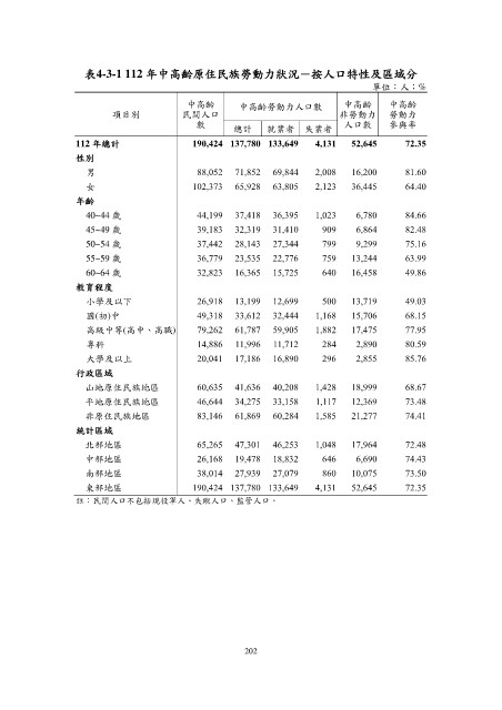 表4-3-1 112 年中高齡原住民族勞動力狀況-按人口特性及區域分