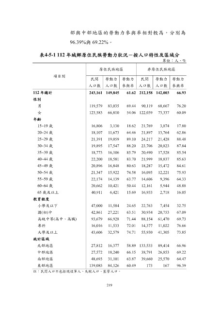 表4-5-1 112 年城鄉原住民族勞動力狀況-按人口特性及區域分