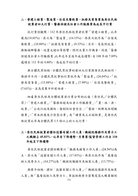 二、營建工程業、製造業、住宿及餐飲業、批發及零售業為原住民族