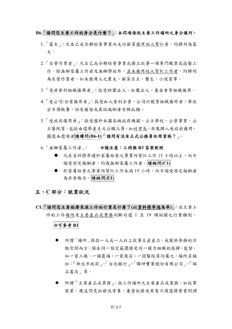 B6.「請問您主要工作的身分是什麼?」:本問項係依主要工作場所之身分填列。