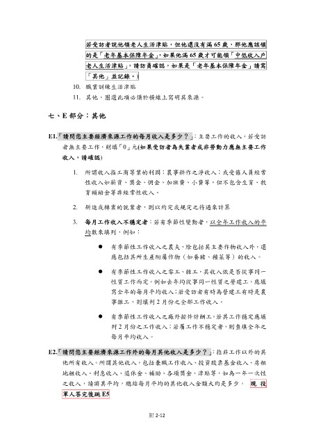 E2.「請問您主要經濟來源工作外的每月其他收入是多少?」:指非工作以外的其