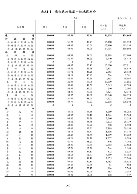 表A1-1 原住民族性別-按地區別分