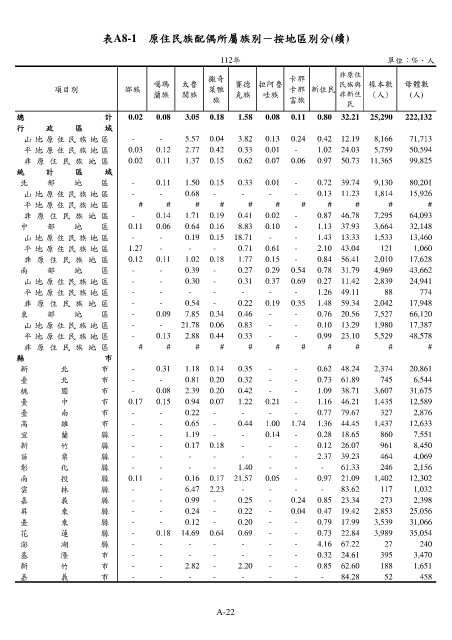 表A8-1 原住民族配偶所屬族別-按地區別分(續)