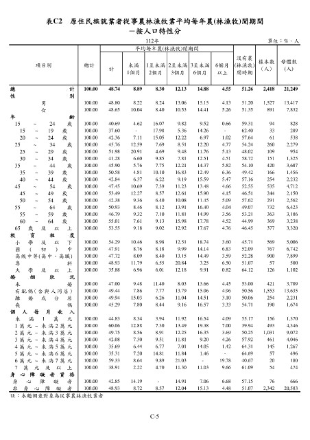 表C2 原住民族就業者從事農林漁牧業平均每年農(林漁牧)閒期間