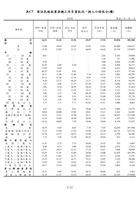 表C7 原住民族就業者總工作年資狀況-按人口特性分(續)
