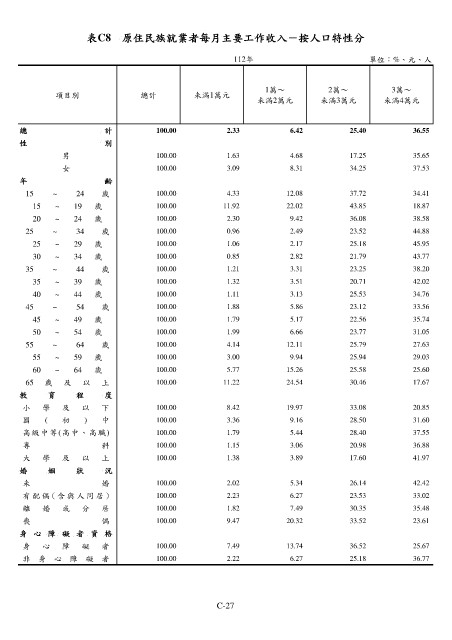 表C8 原住民族就業者每月主要工作收入-按人口特性分
