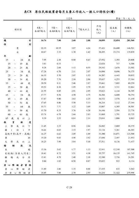 表C8 原住民族就業者每月主要工作收入-按人口特性分(續)