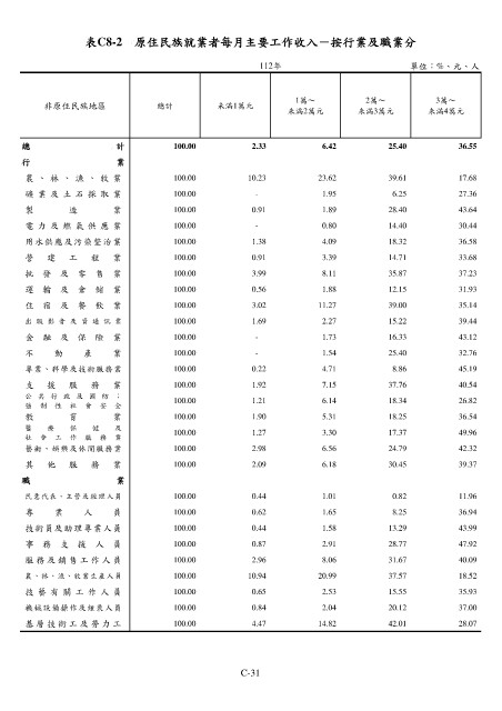 表C8-2 原住民族就業者每月主要工作收入-按行業及職業分