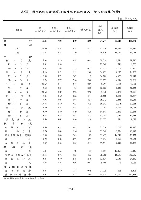 表C9 原住民族有酬就業者每月主要工作收入-按人口特性分(續)