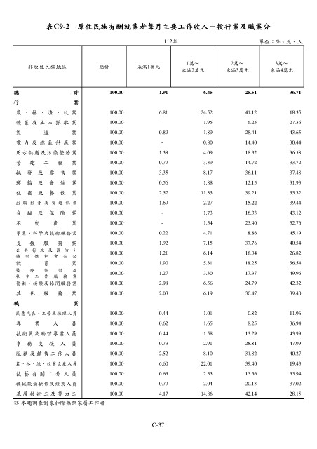 表C9-2 原住民族有酬就業者每月主要工作收入-按行業及職業分