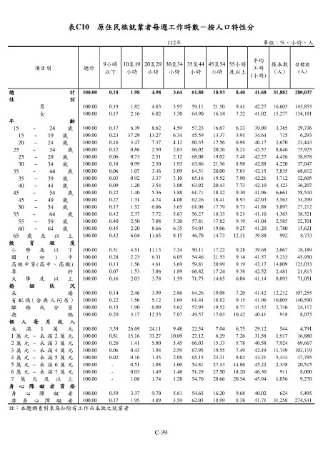 表C10 原住民族就業者每週工作時數-按人口特性分