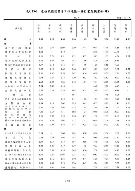 表C15-2 原住民族就業者工作地區-按行業及職業分(續)
