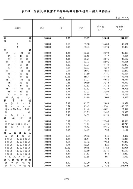 表C24 原住民族就業者工作場所僱用移工情形-按人口特性分