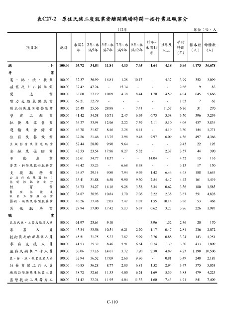 表C27-2 原住民族二度就業者離開職場時間-按行業及職業分