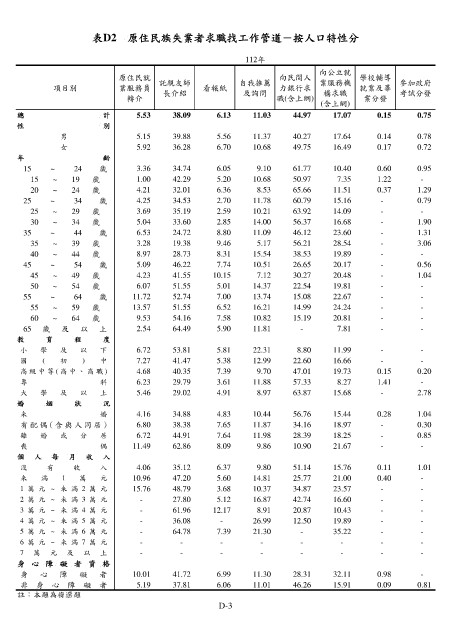 表D2 原住民族失業者求職找工作管道-按人口特性分