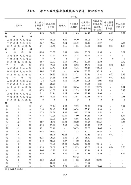 表D2-1 原住民族失業者求職找工作管道-按地區別分