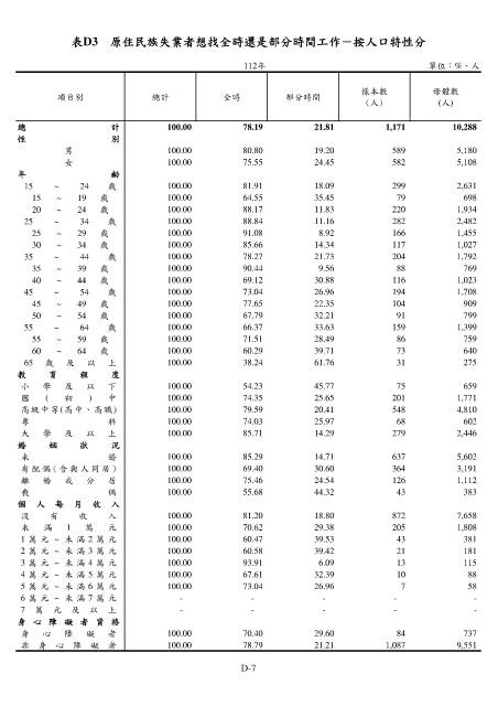 表D3 原住民族失業者想找全時還是部分時間工作-按人口特性分