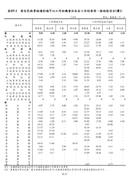 表D5-1 原住民族曾經遇到過可以工作的機會但未去工作的原因-按地區別分(續1)