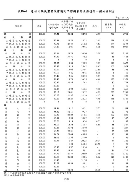 表D6-1 原住民族失業者沒有遇到工作機會的主要情形-按地區別分