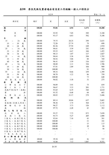 表D8 原住民族失業者過去有沒有工作經驗-按人口特性分