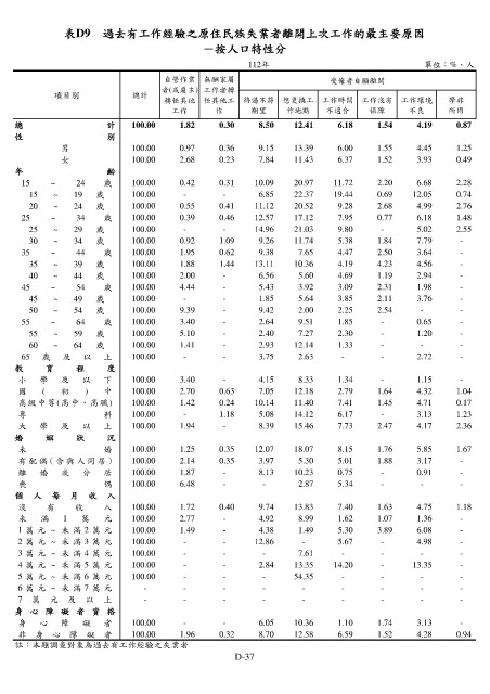 表D9 過去有工作經驗之原住民族失業者離開上次工作的最主要原因