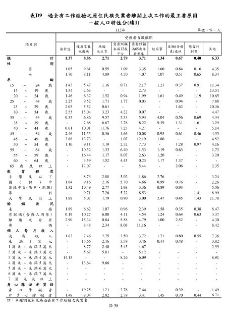 表D9 過去有工作經驗之原住民族失業者離開上次工作的最主要原因
