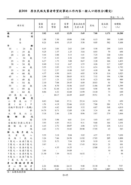 表D10 原住民族失業者希望從事的工作內容-按人口特性分(續完)
