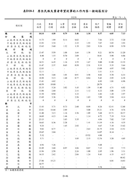表D10-1 原住民族失業者希望從事的工作內容-按地區別分