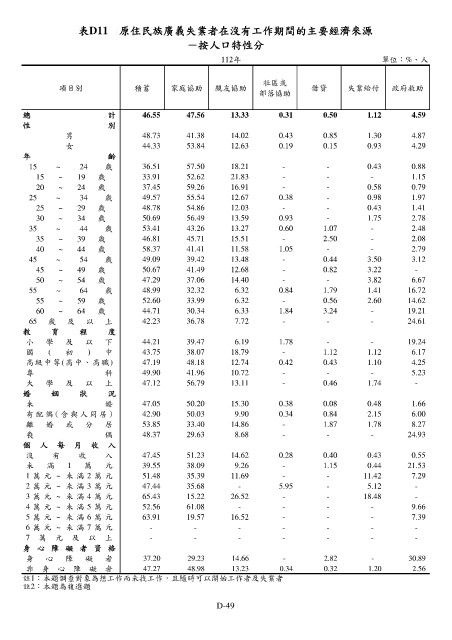 表D11 原住民族廣義失業者在沒有工作期間的主要經濟來源