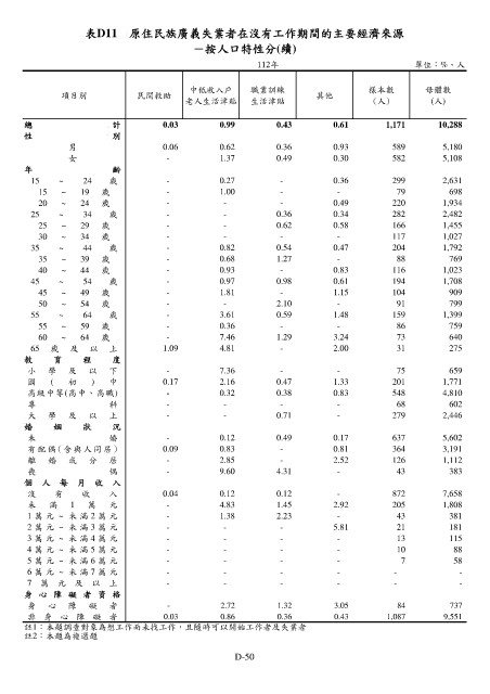 表D11 原住民族廣義失業者在沒有工作期間的主要經濟來源